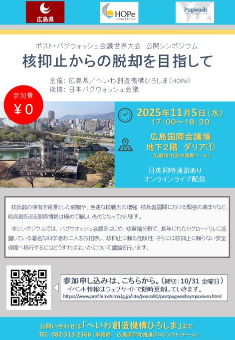 ポスト・パグウォッシュ会議世界大会公開シンポジウムを開催どうすれば核抑止に頼らない安全保障システムが構築できるのか皆様と一緒に考えたいと思います。ぜひご参加ください11/5(水)17時~18時半広島国..