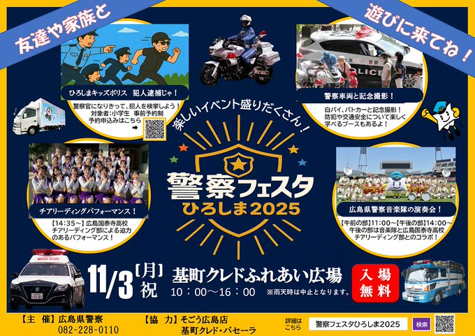 \警察フェスタひろしま2025/11月3日(祝・月)当日は晴れ予報です!皆さんのご来場を心よりお待ちしています!詳しくはこちら↓https://pref.hiroshima.lg.jp/site/po..