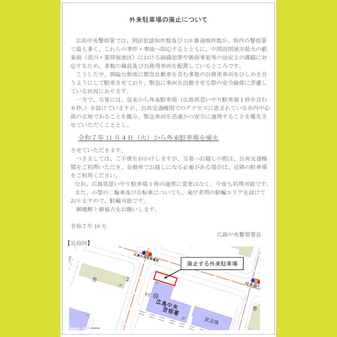 【広島中央警察署からのお知らせ】令和7年11月4日(火)から外来駐車場を廃止させていただきます。ご不便をおかけしますが、御理解と御協力をお願いします。詳しくは、広島中央警察署のホームページをご覧くださ..
