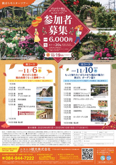 申込締切間近!秋ばらモニターツアー参加者募集!11/6(木)・11/10(月)発の2コース。ばらガイドの案内や昼食付。モニターツアーのお得な料金でお楽しみいただけます。各6,000円/定員20名詳細・..