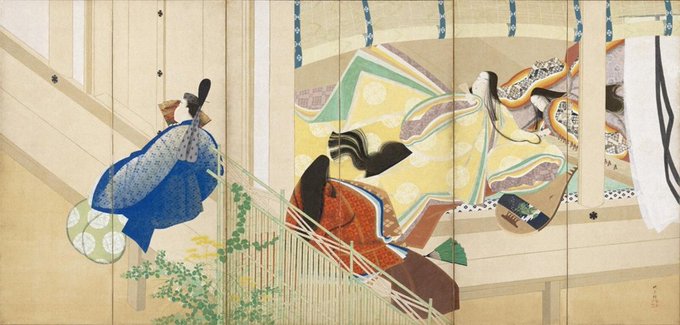 今日は#鏡開きの日です新年にお餅を飾る風習は、平安時代にはすでにあったといわれています丸いお餅を神聖な鏡に見立てて、歳神様にお供えしていました画像は#源氏物語の1場面を描いた#松岡映丘の作品《宇治の宮..