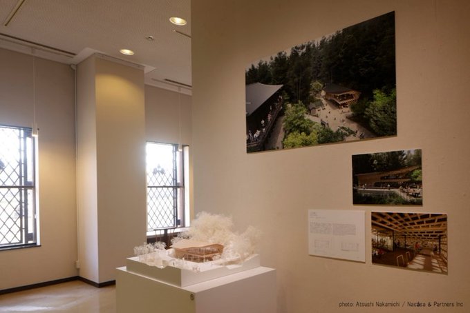 「隈研吾の『コツゴツ』哲学」展で展示中の《ハヅキ茶屋》。#書寫山圓教寺の憩いの場「はづき茶屋」の将来像を隈研吾が構想して模型にしたものです。模型横のモニターでは「はづき茶屋」の名称の由来や隈研吾による..