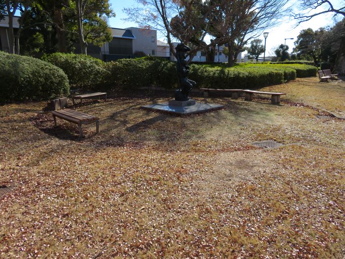 本日は、前庭の休憩スペースをご紹介。彫刻を囲むようにベンチが連なり、お城周辺の散歩を楽しまれる方が骨休めをされることも。ほっと一息つける場所ですが、ここから見える景色も中々のものです。