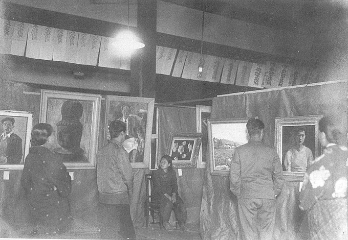 #姫路市美術展は今回で78回を迎えます。第1回は戦後まもなくの昭和21年11月に開催されましたが、会場はなんと亀山本徳寺でした。この時の洋画部門の市長賞第1席は中井知生の《K氏像》(右から3点目)で、..
