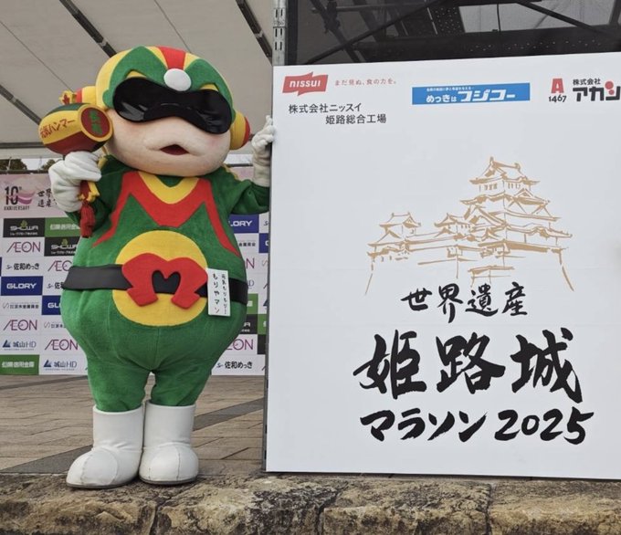 グッも〜りん 姫路城マラソン2025が大盛況だったみたいもり〜、もりやマンも大手前公園でフル稼働もりよ 全ての方々にお疲れ様エールを送らせていただきますもり! みなさん、疲れをとるナイスな方法とかご存知ですもり?