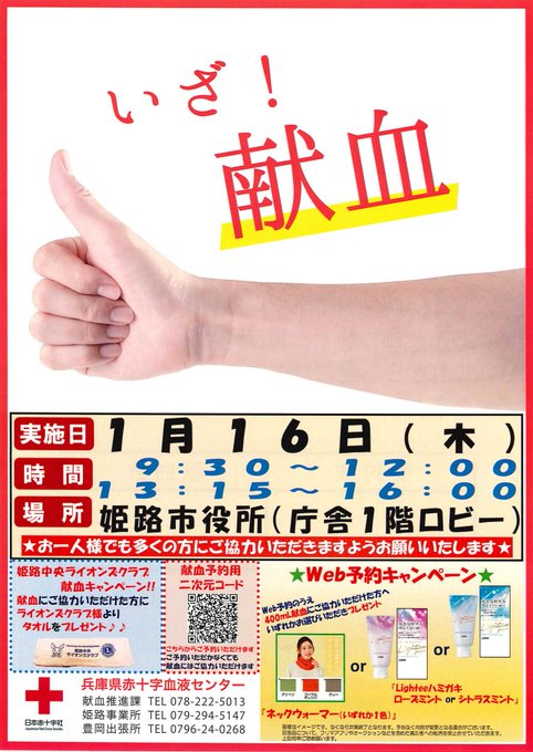 1月16日(木)姫路市役所で献血を実施しますラブラッド会員は前日17時まで事前Web予約できます今、あなたのご協力が必要です市役所に行くご予定がある方近くに行く用事がある方ぜひ献血にご協力をお願いしま..