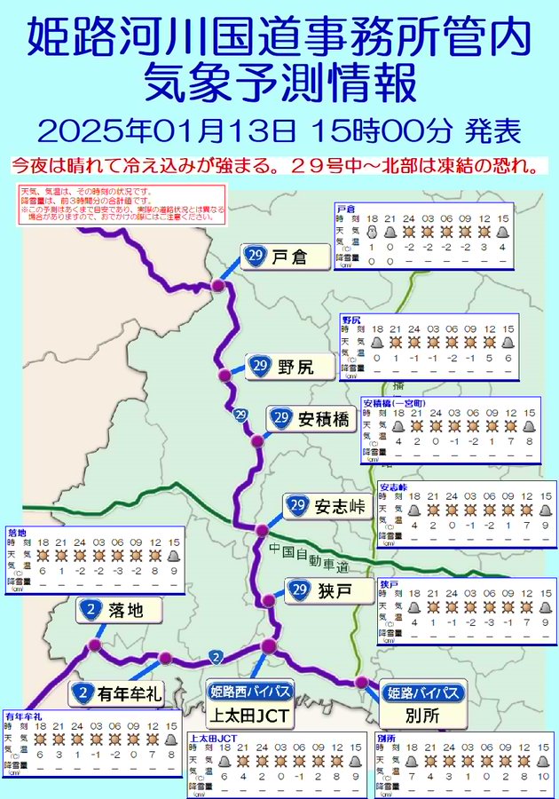 #姫路河川国道事務所管内では今日夕方は雲が広り、#国道29号#戸倉方面で小雪がちらつきますが、その後明日昼頃にかけては全般に晴れるでしょう。今夜は冷え込みが強く、戸倉~野尻方面は残雪の染み出し水による..