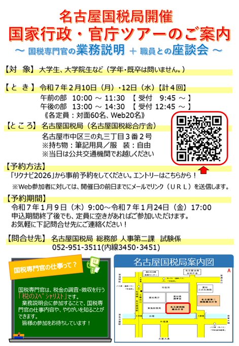 【#名古屋国税局採用関係情報】/#国税専門官の#業務説明を行います!\「国家行政・官庁ツアー(人事院主催)」概要日時2月10日(月)・12日(水)(各日2回ずつ開催)内容業務説明若手職員との座談会We..
