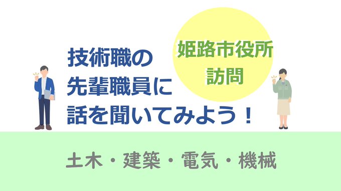 \\お知らせ//姫路市役所では、技術職職員の業務内容や職場の雰囲気を知りたい方に、実際に職場を訪問してもらい、先輩職員に直接話を聞いて、進路決定に役立ていただくために職場訪問を実施しています。学年は問..