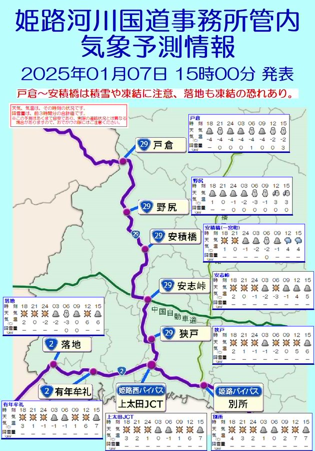 #姫路河川国道事務所管内では明日の朝にかけて、#国道29号北部から中部を中心に#雪が降る見込みです。#戸倉から安積橋では積雪や凍結にご注意ください。#国道2号でも雪のちらつく所があるでしょう。走行時は..