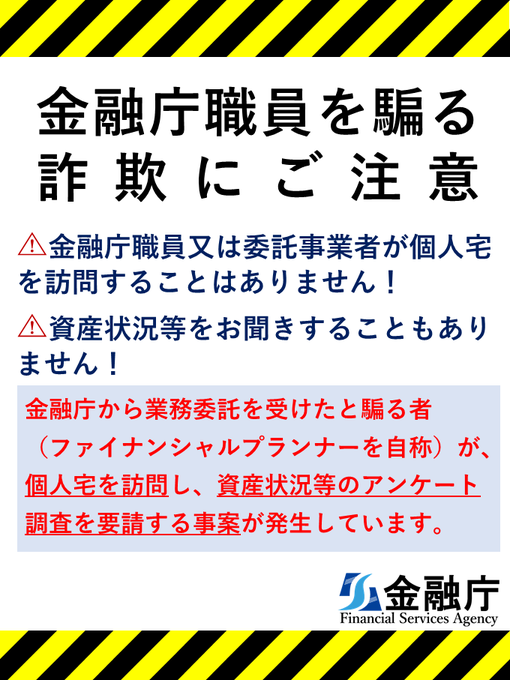 /金融庁を騙(かた)った詐欺にご注意\金融庁から業務委託を受けたと騙る者(ファイナンシャルプランナーを自称)が個人宅を訪問し、#資産状況等のアンケート調査を要請する事案が発生しています。くれぐれもご注..