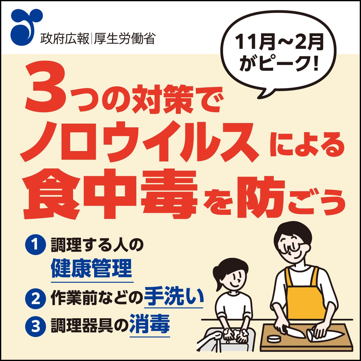 /11月から2月がピーク!ノロウイルスによる食中毒を防ぐ3つの対策!\調理する人は健康管理を心がける作業前などのしっかりとした手洗い調理器具の熱湯や塩素消毒液による消毒詳しくはコチラhttps://g..
