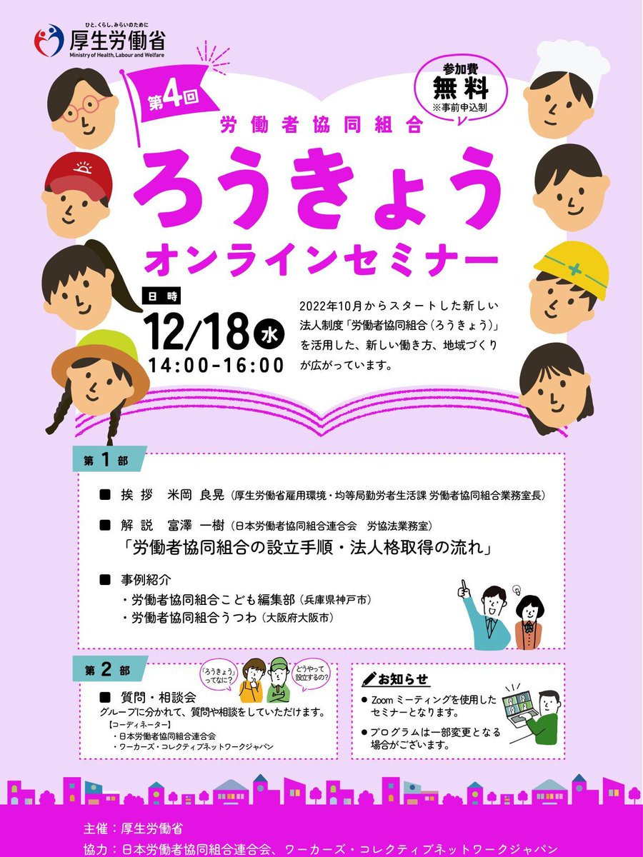 【12/18第4回ろうきょうオンラインセミナー】締め切り間近!#労働者協同組合の設立手順・法人格取得の流れを初めての方にもわかりやすく解説。事例紹介や質問・相談会もあります。参加無料・要事前申し込み(..