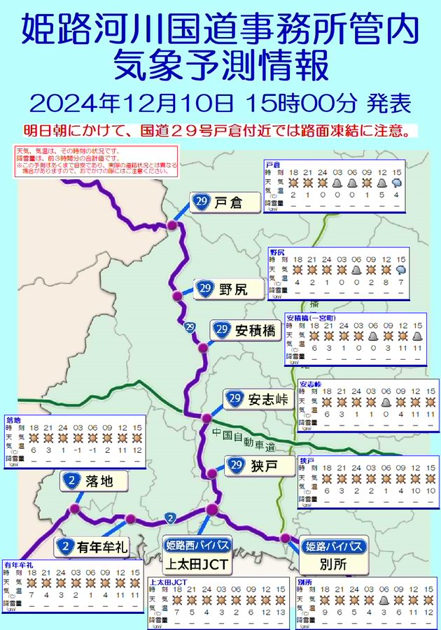 #姫路河川国道事務所管内の#国道29号では、おおむね晴れる所が多いでしょう。#戸倉付近では湿潤箇所や路肩に残る#雪からのしみ出しによる凍結にご注意ください。明日日中は次第に雲が広がり、雨が降り出すでし..