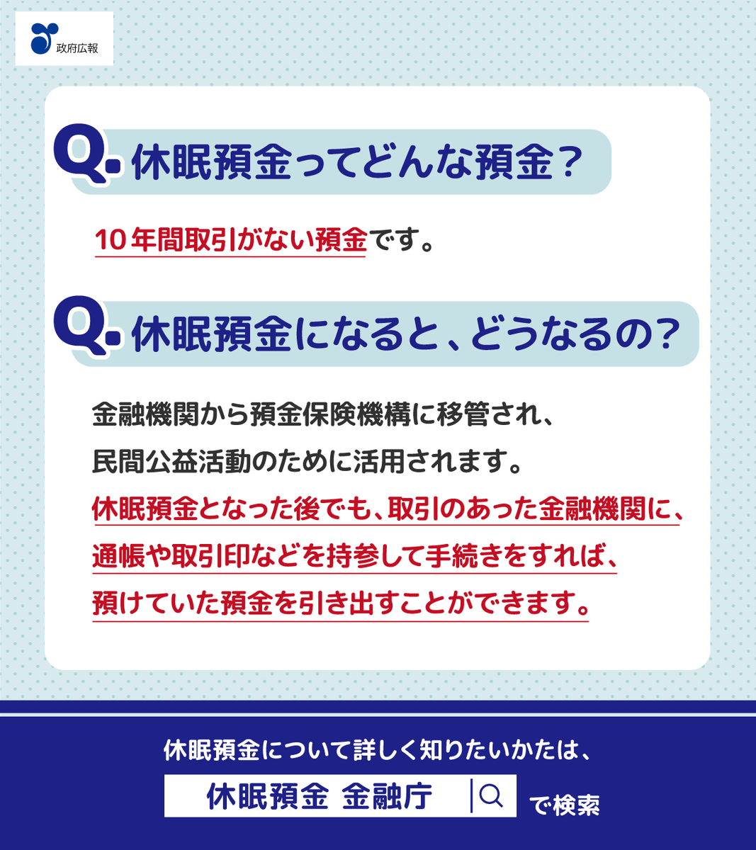 /放置された預金口座、ありませんか?\こどもの頃に親が作った口座、学生時代や転勤先で作った口座など…思い当たる節はありませんか?10年間取引がない預金は「休眠預金」になってしまいます年末の大掃除の際に..