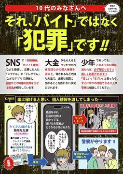 10代のみなさんへ。「闇バイト」は犯罪。絶対に応募しないでください。犯罪に加わる前に、勇気をもって周りの信頼できる大人や近くの警察に相談してください。警察庁、文部科学省と連携し、啓発資料「それ、「バイ..
