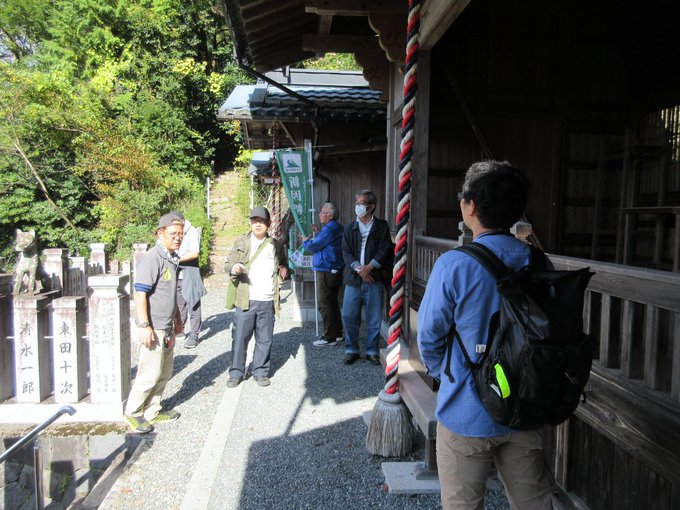 日本風景街道「新因幡ライン~ふるさとに出会う幸福(29)ロード~」の活動の一環として『#軽トラ市・名馬伝説ウォーク』に参加しました・宝殿神社で名馬伝説を学ぶようす(左上)・波賀城と波賀城からの眺望(右..
