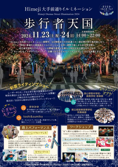 11/23&24の2日間大手前通りの一部が#歩行者天国になります車道から#姫路城と#イルミネーションを一緒に楽しめるスペシャルデー特別なライティングショーやステージイベントフードマルシェの出店など盛り..