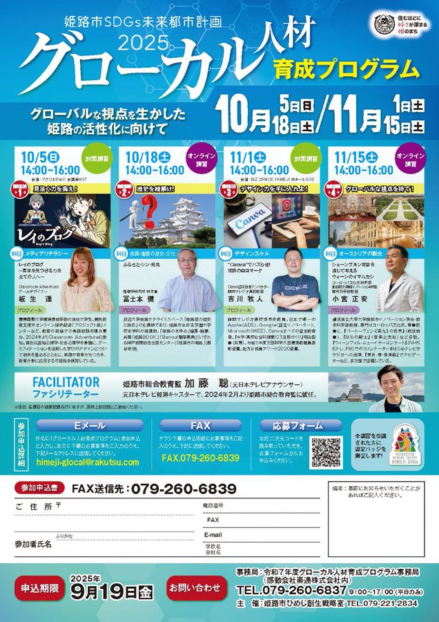 「グローカル人材育成プログラム」受講者募集姫路市SDGs未来都市計画に掲げるグローカル人材(国際的な視野を持ち、姫路で活躍できる人材)にふさわしい姫路・播磨に関する知識や異文化コミュニケーション力、表..