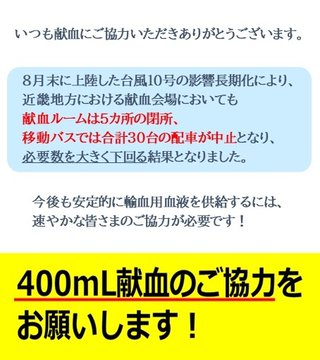 9月に入って少し涼しくなりましたが今日は暑いですね~先日の台風の影響で献血ルーム閉所や献血バスが中止に…今こそ、皆さんからの献血のご協力が必要です県内の献血ルーム等はここでチェックhttps://bs..