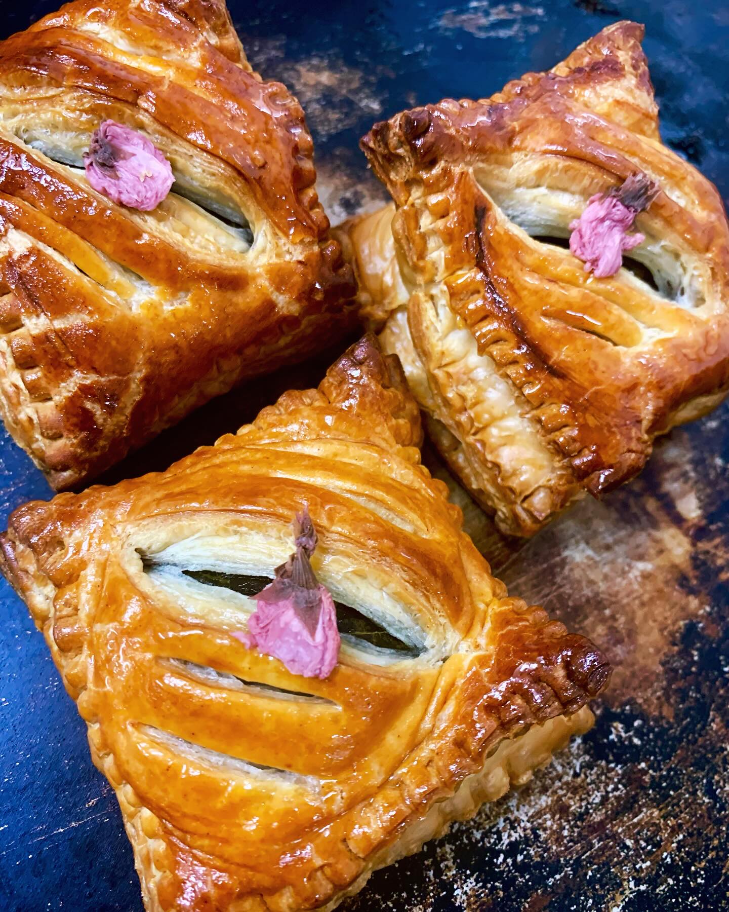 ・🌸春季限定《桜もちパイ》🌸自家製パイ生地の中に、・桜の葉・桜あん・求肥(おもち)を包み込みました❣️桜の葉の程よい塩味と桜あん、求肥の甘味がマッチした桜づくしの春を感じられる商品となっています☺️#..