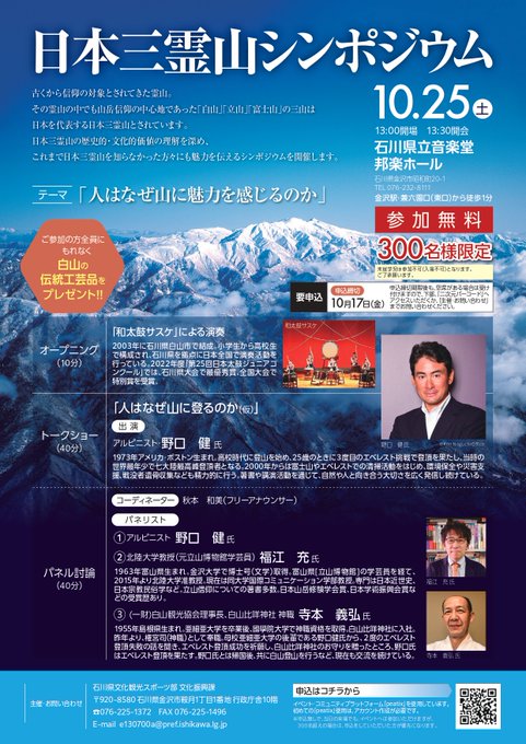 \アルピニスト#野口健さん登壇/日本三霊山シンポジウム#日本三霊山である白山・立山・富士山の魅力を語ります!#和太鼓サスケの迫力ある演奏もさらに!参加者全員に白山の伝統工芸品をプレゼント10/25(土..