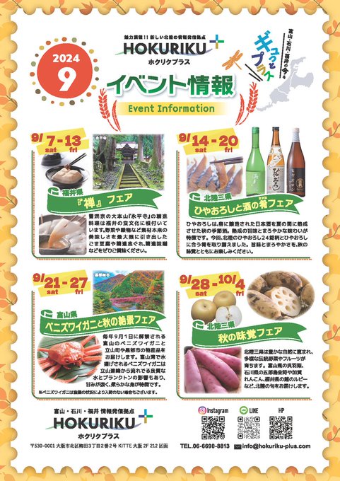 /HOKURIKU+今月のフェア情報\ひやおろしと酒の肴フェアでは、能登の酒蔵から#金の星と#能登末廣がぜひ#飲んで応援お願いします!#KITTE大阪で北陸の秋の旬を楽しんでください富山・石川・福井情..