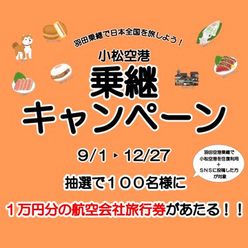 /1万円分の航空会社旅行券があたる~小松空港乗継キャンペーン~\小松・羽田便の乗継利用(往復)+SNS投稿で、抽選で100名様に、1万円分の航空会社旅行券があたる#キャンペーンを開催中!<応募方法>①..