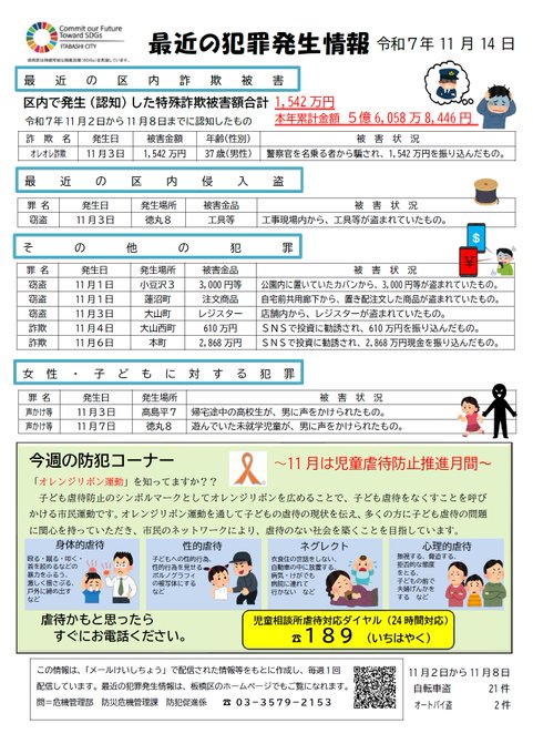 【最近の犯罪発生情報令和7年11月14日号】・11/2~11/8の区内特殊詐欺被害額合計→1,542万円#BAN闇バイト#特殊詐欺#防犯情報