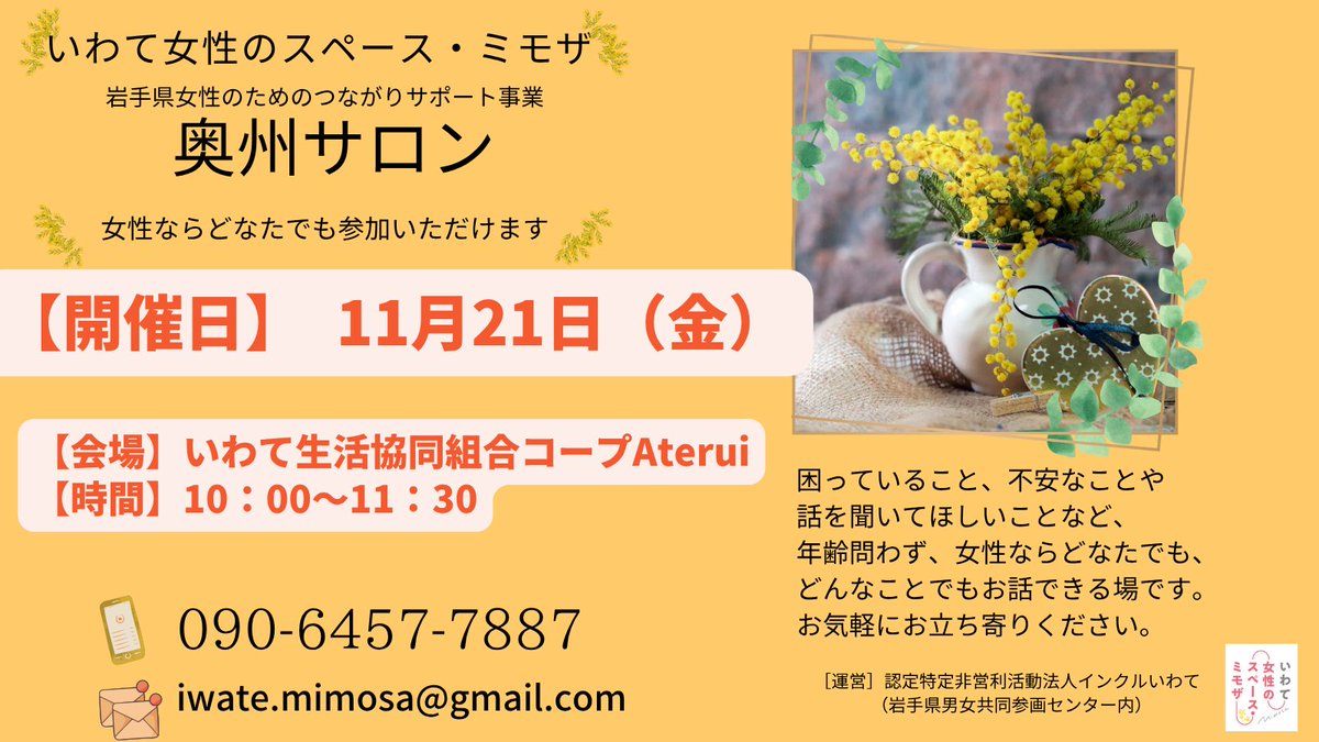 \いわて女性のスペース・ミモザ/原則、毎月第3(金)は奥州サロンの日!10:00~11:30いわて生活協同組合コープAterui女性ならどなたでも、どんなことでもお話できる場です。お気軽にお立ち寄りく..