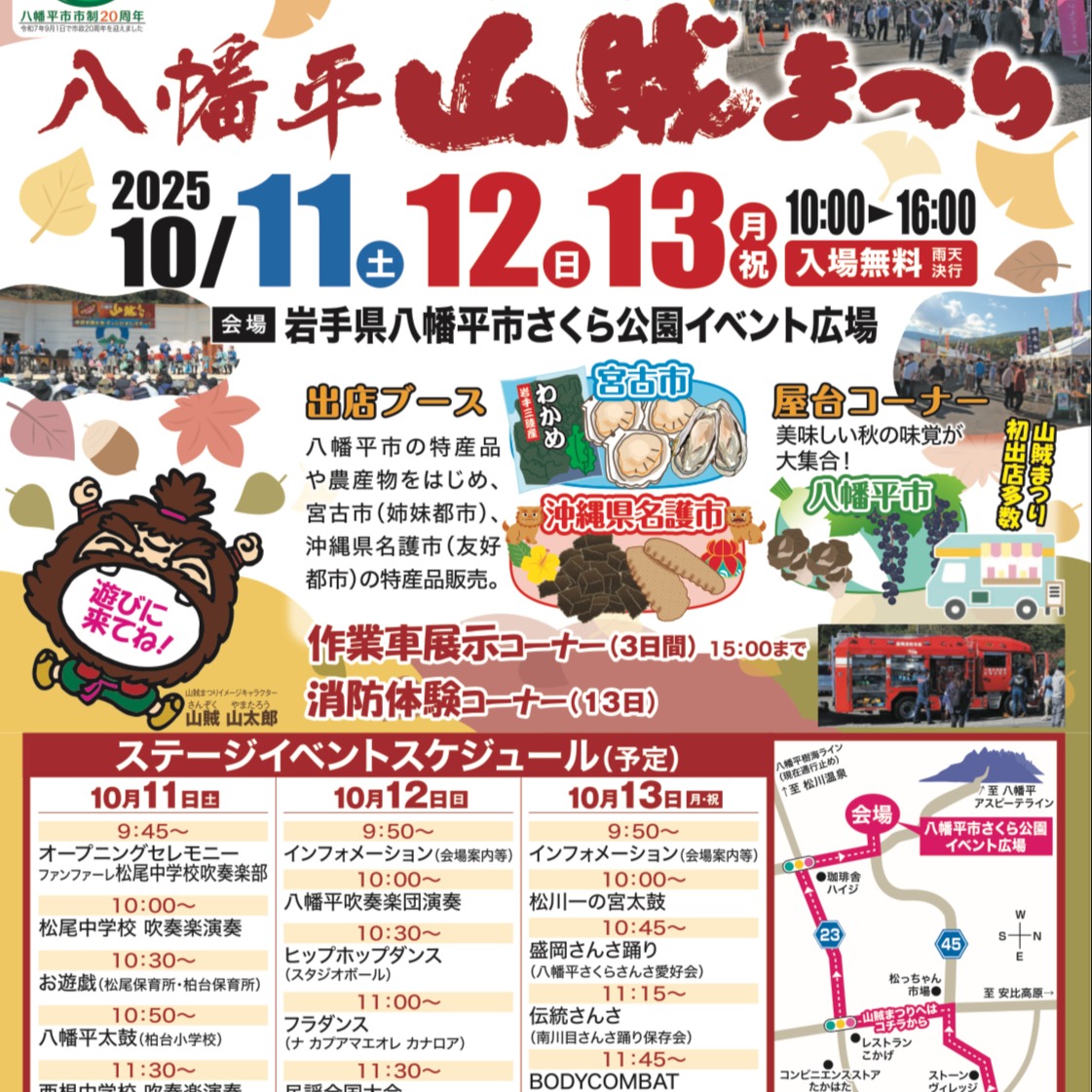 昨日(10/11)から3日間、八幡平市さくら公園にて、「八幡平山賊まつり2025」開催中です!宮古市や沖縄県名護市の特産品をはじめ、様々なお店が軒を連ねています。あいにくの天気でかなり冷え込んでいます..