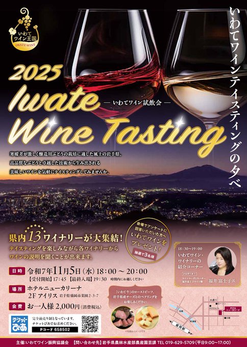 【11/5(水)いわてワインテイスティングの夕べ】いわてワインをテイスティングしてみませんか県内ワイナリー13社が集結!ワインの特徴を聞きながら、気軽にテイスティングを楽しむことができます詳しくはht..