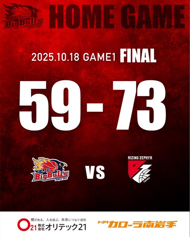 2025.10.18[SAT]#岩手ビッグブルズ#ライジングゼファー福岡◤試合終了◢岩手59-73福岡今日もたくさんのご声援ありがとうございました!明日も応援をよろしくお願いします!見逃し配信http..