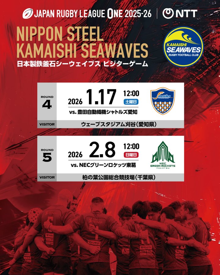 /NTTリーグワン2025-26第4節、第5節キックオフ時間が決定\<第4節VISITOR>1/17(土)12:00K.O.ウェーブスタジアム刈谷(愛知県)豊田自動織機シャトルズ愛知@shokki_s..