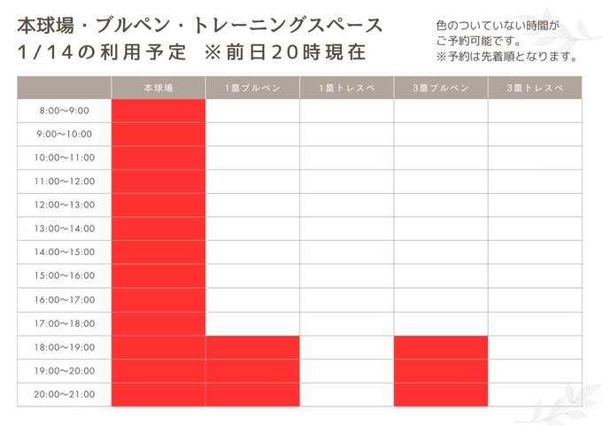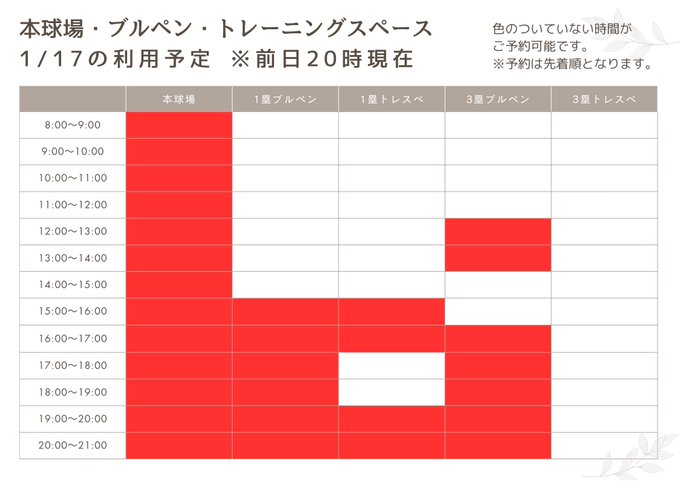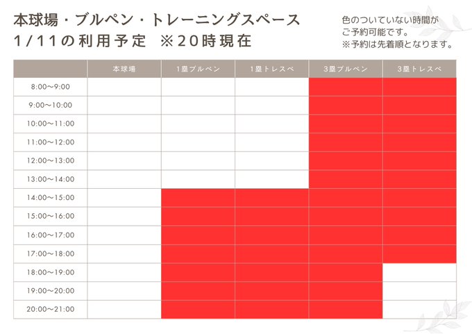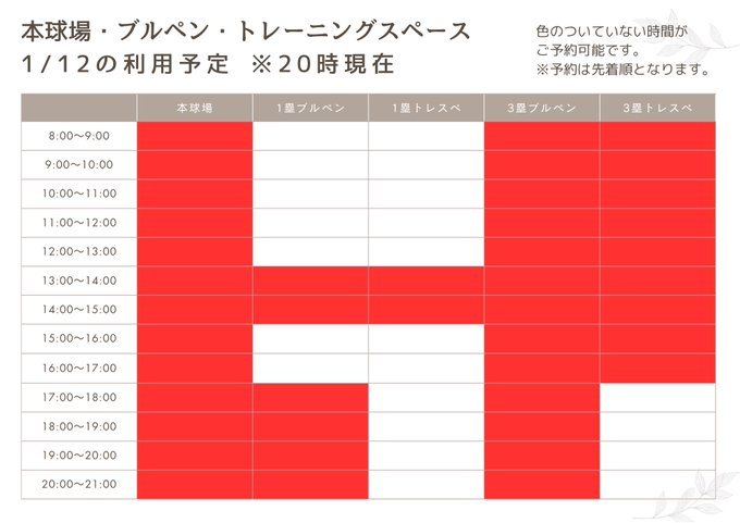 みなさまこんばんは明日1/11の利用予定です明日は屋内練習場全て埋まっておりますがブルペン、トレーニングスペースの方はまだ空きがございますぜひご利用お待ちしておりますご予約はこちらからhttp://r..