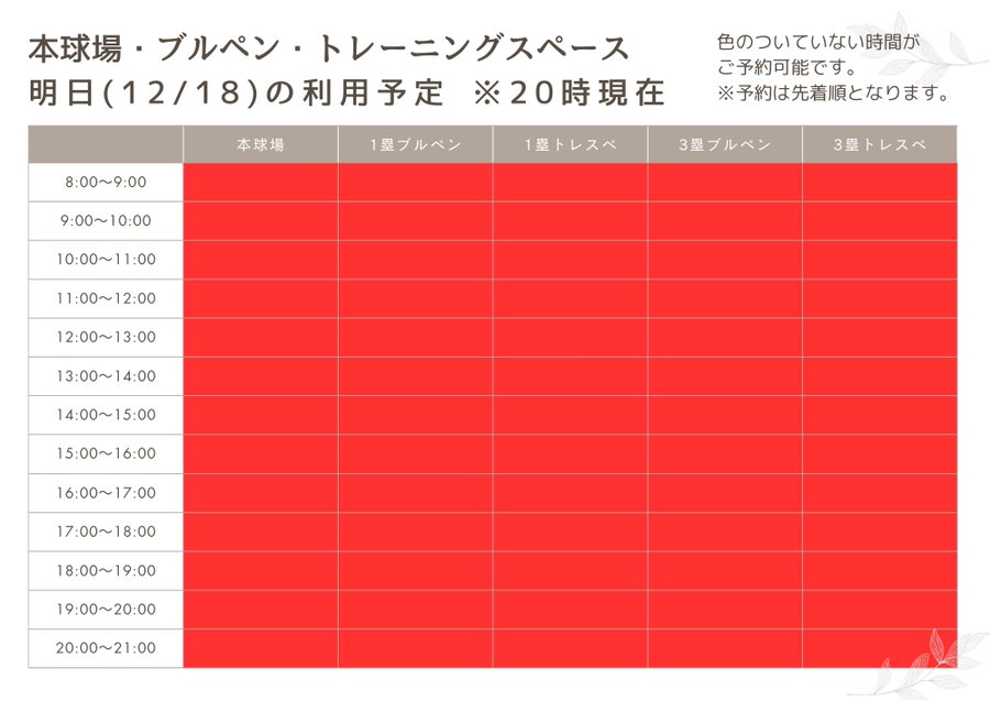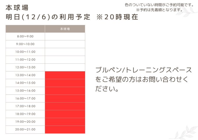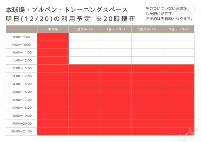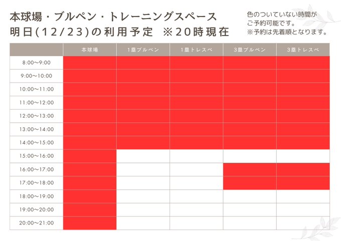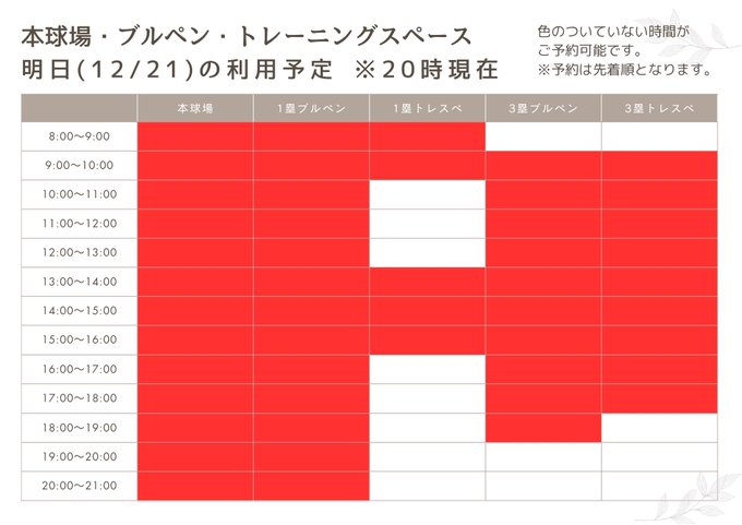 みなさまこんばんは明日12/21の利用予定です屋内練習場は埋まっておりましたがブルペン、トレーニングスペースともにまだ空きがございますご利用お待ちしておりますご予約はこちらからhttp://reser..