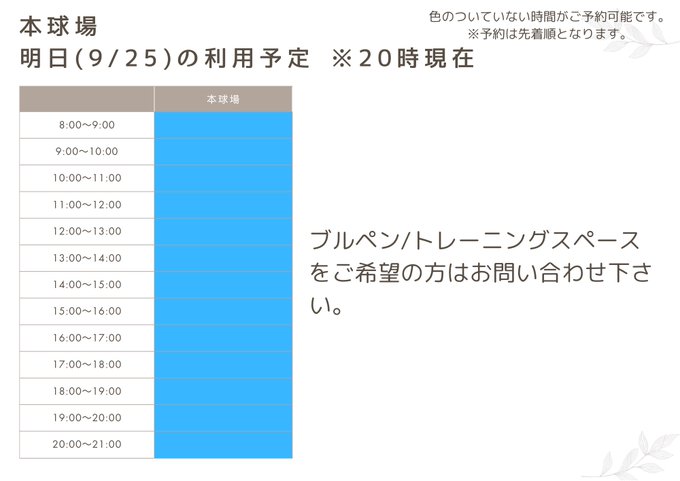 みなさまこんばんは明日9/27の利用予定です明日の「第77回秋季東北地区高校野球岩手県大会」は休養日になっております屋内練習場の空きがございますのでぜひご利用お待ちしておりますご予約はこちらからhtt..
