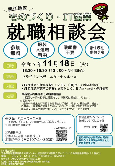 【胆江地区】ものづくり・IT産業就職相談会参加者募集中(参加無料)お仕事を探している方はもちろん、生徒・学生・家族の方の情報収集も大歓迎です開催日時:11/18(火)13:30~15:30会場:プラザ..