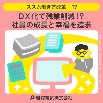 《新着記事を公開しました!》ススム働き方改革/17DX化で残業削減!?社員の成長と幸福を追求岩舘電気株式会社「いわてのひかり〜♪いわだてでんき〜♪」でおなじみの岩舘電気は、病院や学校、官公庁施設など電..