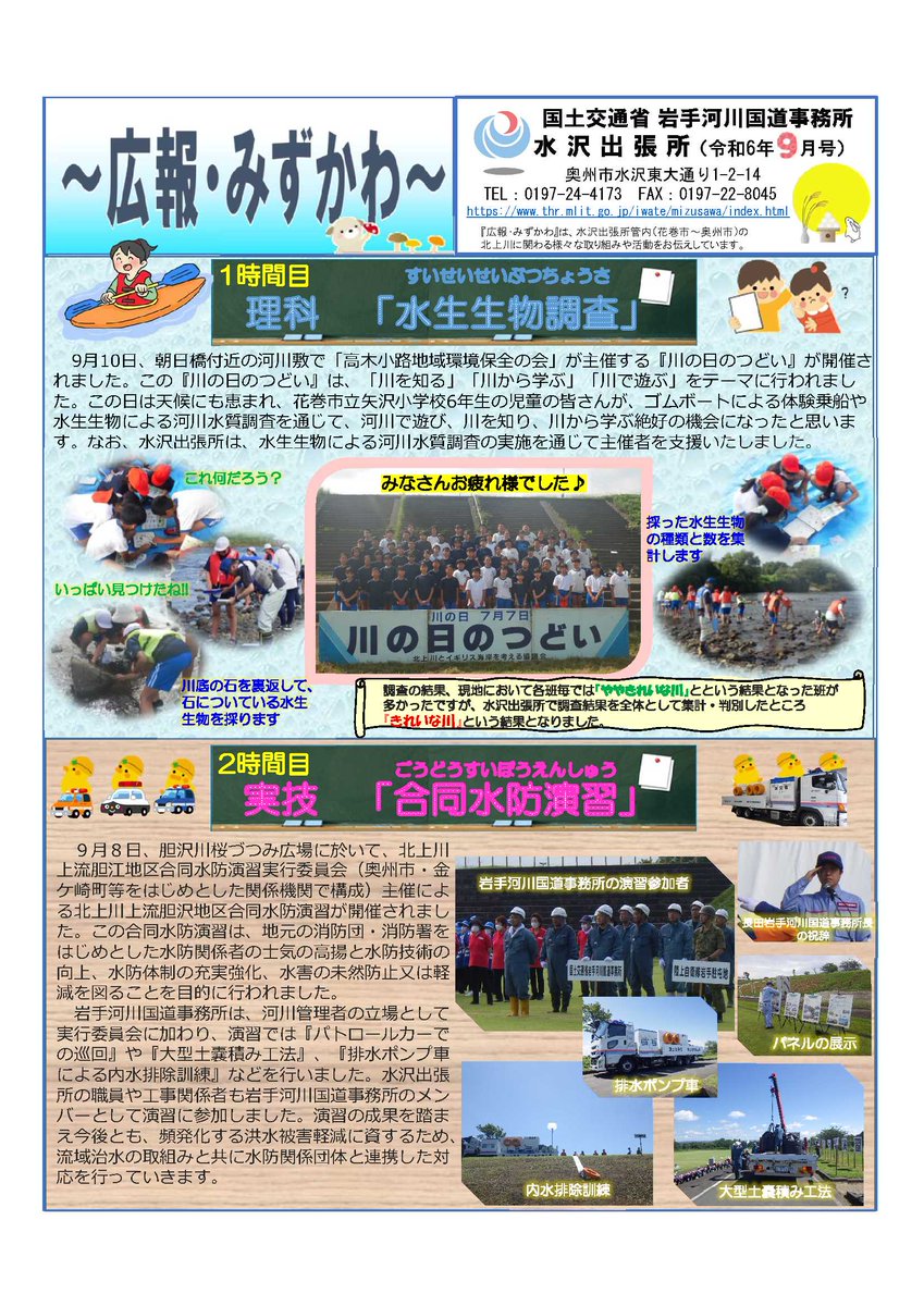 「広報・みずかわ令和6年9月号」を発行しました。~水生生物調査~~合同水防演習~バックナンバーは、水沢出張所HPをご覧ください。https://thr.mlit.go.jp/iwate/mizusaw..