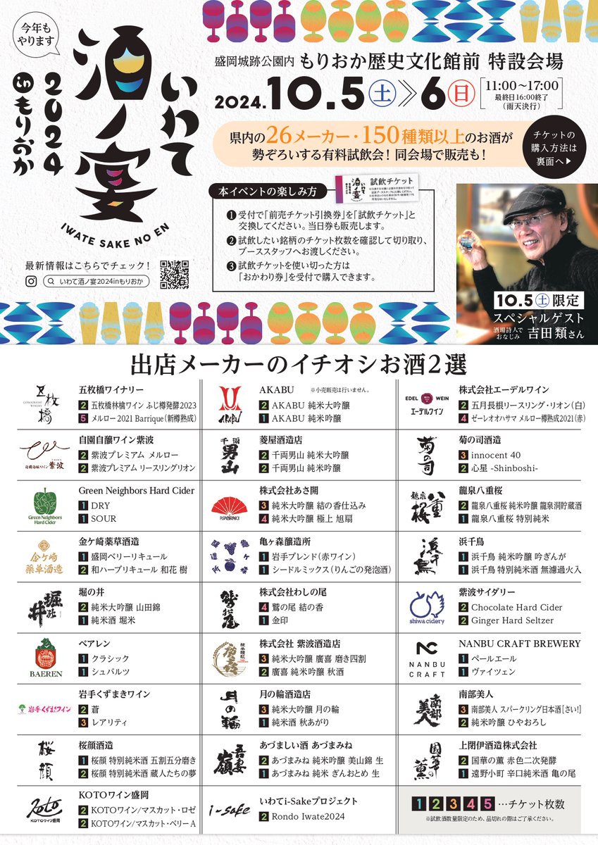 【10/5(土)、6(日)「いわて酒ノ宴2024inもりおか」開催!】場所:盛岡城跡公園内もりおか歴史文化館前特設会場今年で2年目のお客さんと蔵元が交流できるお酒とグルメを一堂に会したイベント「いわて..