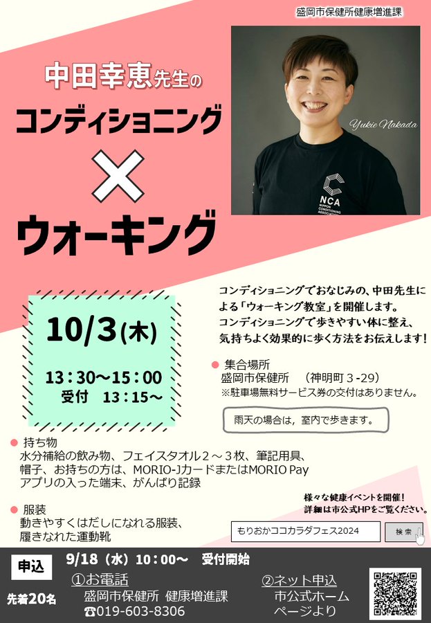 【コンディショニング×ウォーキング教室】コンディショニングでおなじみの中田幸恵先生によるウオーキング教室を開催します!肴町アーケードを含むルートを30分程度歩きます。申し込みは現在、受け付け中です。詳..