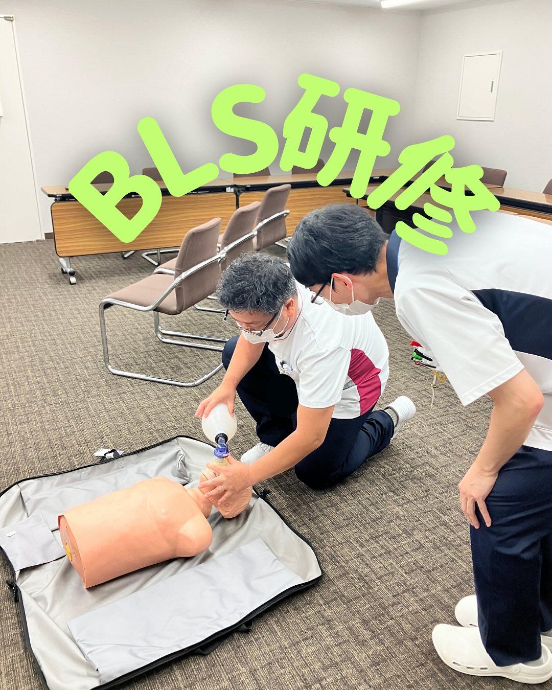 【BLS研修】AHAのBLS/ACLS研修を受けた職員が院内でBLS研修を行いました。胸骨圧迫(心臓マッサージ)30回バックバルブマスクにて人工呼吸2回これを繰り返して、その間にAEDを起動し音声ガイ..
