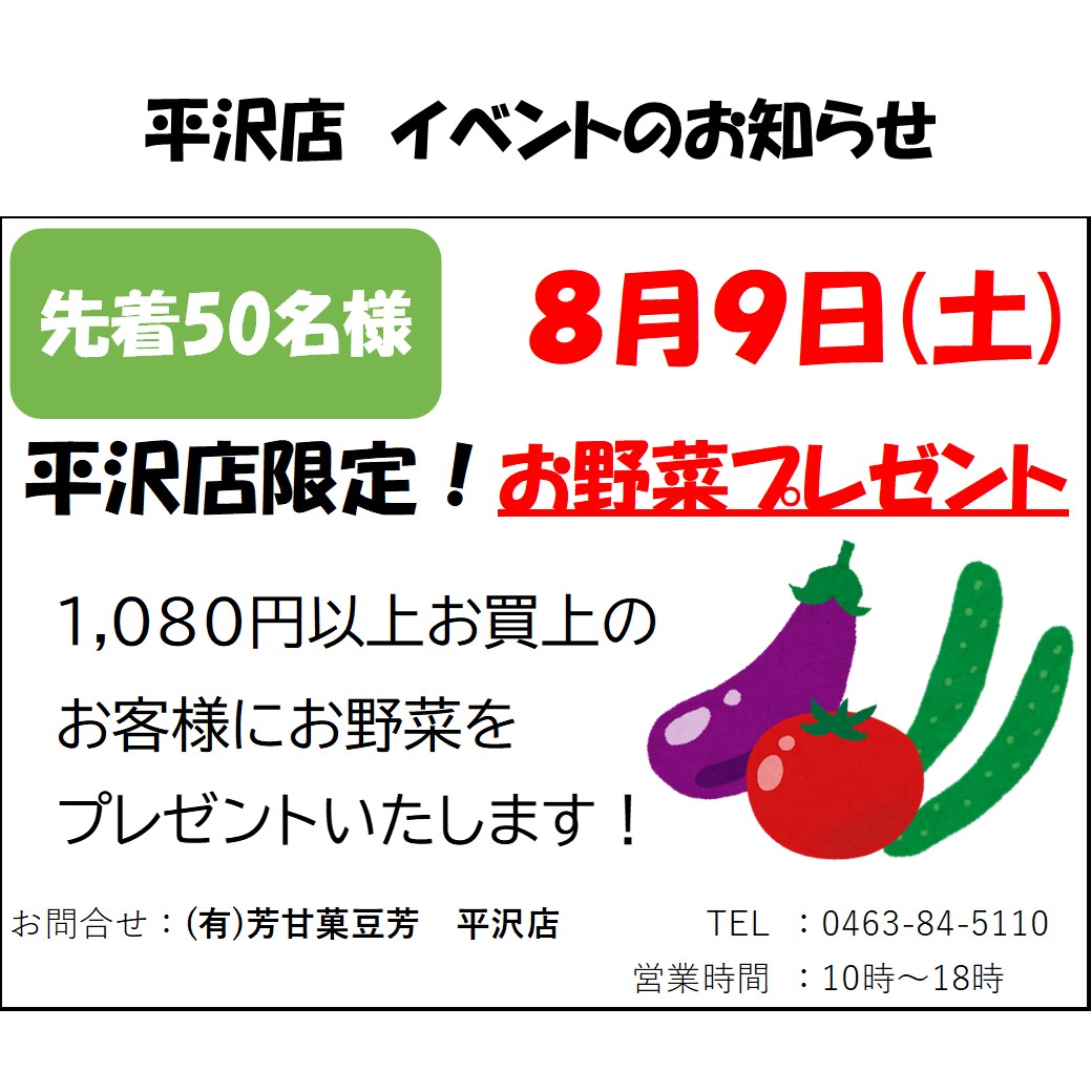...緊急告知📢8月9日(土)、平沢店限定イベントのお知らせ!【先着50名様限定】1,080円以上お買上げのお客様にお野菜をプレゼントいたします🍅芳甘菓のドレッシングと一緒にお楽しみください😊🥜ピーナ..