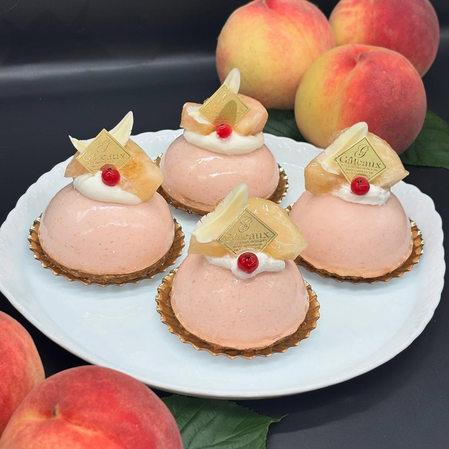..〜午後のひととき〜白桃ムース🍑桃ムースの中に苺とフランボワーズを合わせたジュレを入れました。イギリス産アールグレイを使用したアーモンドスポンジがふんわり口の中にひろがります桃のさっぱりした優しい甘..