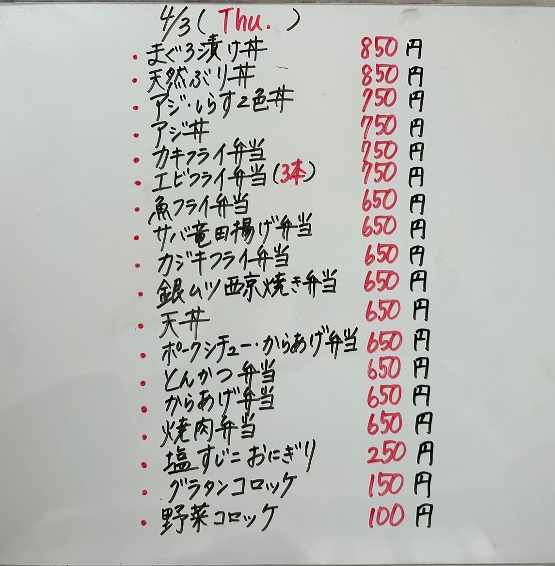 大倉入口の『すし春弁当』です。画像①4/3(木)本日のメニュー(すべて税込み)レジ袋有料化・CO2削減・環境保全にご協力ください🙇♂️魚春・鮨市場春・すし春弁当はレジ袋が有料です。マイ..