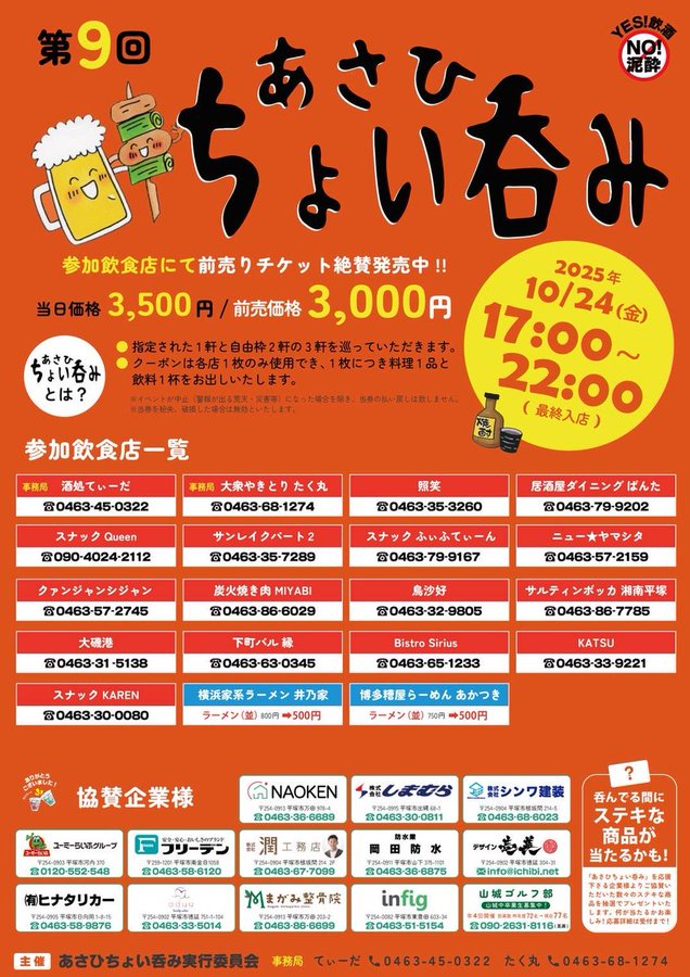 旭地区にある「サンロードあさひ商店会協同組合」がオリジナルの料理1品とドリンク1杯を楽しめるはしご酒イベントを開催します。チケットを購入すると、指定の1店と自由に選べる2店の計3店で飲食を楽しめます。..