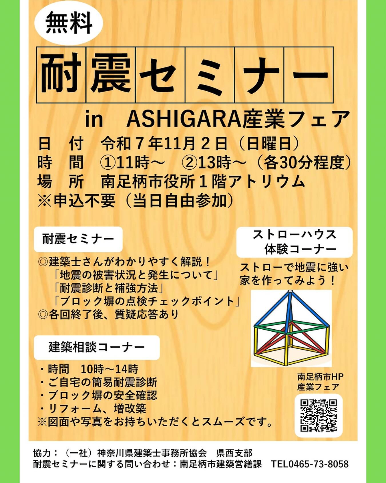 「ASHIGARA産業フェア」で建築士による無料耐震セミナーを開催します🏠耐震診断と補強方法や、ブロック塀の安全確認チェックポイントなどを聞くことができます。他にも、ご自宅の簡易耐震診断やブロック塀の..