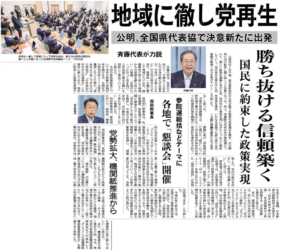 公明党、全国県代表協議会で再スタート斉藤代表「立党の原点に立ち返り、地域密着で信頼を勝ち取る」「物価高対策や奨学金減税など、公約実現に全力」西田幹事長「アクティブサポーター拡大で得票増の流れ」「SNS..