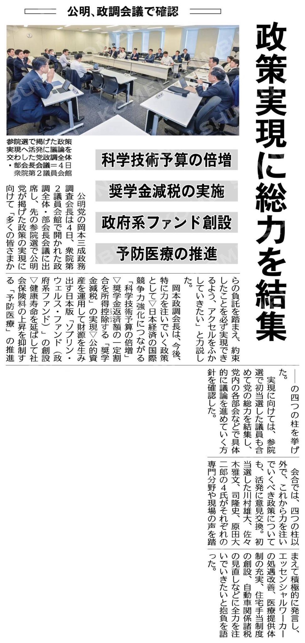 政策実現に“総力戦” 先の参院選でお約束した 科学技術予算の倍増 奨学金減税の実施 政府系ファンド創設 予防医療の推進 「必ず形にする!」と岡本政調会長。 生活現場の声を原点に、実行力で応えていきます
